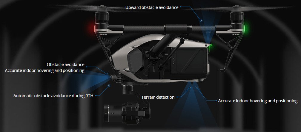 The build level of quality is almost unimportant, however, simply because of the sheer number of counter measures DJI has integrated in the Inspire 2. The mentioned FPV camera and obstacle-avoidance technique track for incoming physical objects 30 meters ahead, while the upward-facing infrared sensors scan for objects 5 meters above the drone, which is useful when you’re flying in enclosed areas. Terrain recognition sensors installed to the bottom of the Inspire 2 round off the package.