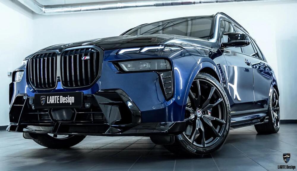 2. Dual-Tone and Color Options – Larte Design often showcases the X7 in striking color schemes, such as Frozen Pure Grey Metallic with matte black and glossy accents, creating a high-contrast, two-tone look that sets it apart from standard models. Another notable example is a silver-to-dark-blue transformation with glossy black accents, highlighting the tuner’s ability to personalize the vehicle’s appearance. These color choices, combined with carbon fiber elements, give the X7 a predatory, almost cinematic presence—described by some as looking like a “Predator in a carbon fiber trenchcoat.”