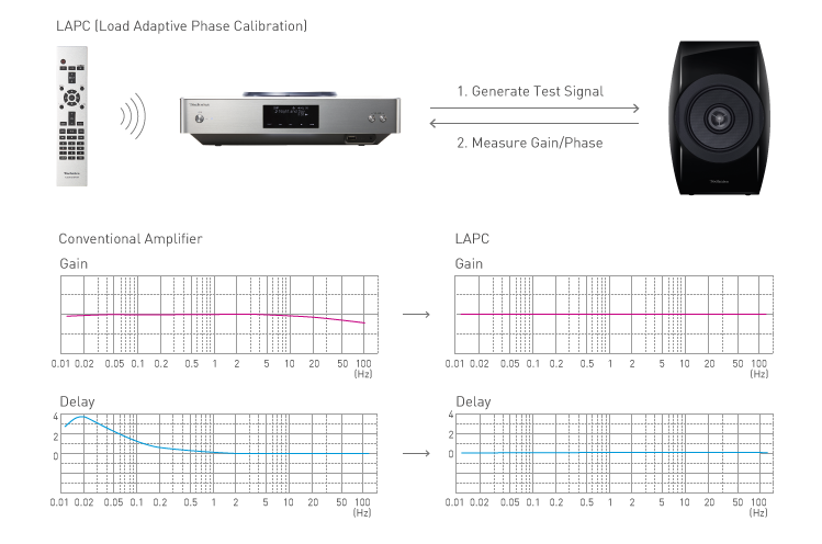 LAPC is an unique speaker load adaptive technology from Technics. With speakers connected to the amp, it analyzes the frequency amplitude phase characteristics and applies digital signal processing to provide the optimal impulse response.