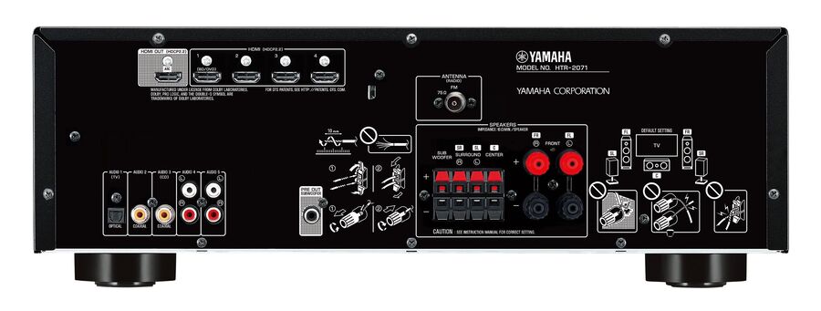 The Yamaha HTR-2071 is adaptable enough for the most sophisticated AV setups thanks to its four HDMI inputs. There are also many other inputs available for any older sources you may have, like DVD and CD players. You can connect 5 audio sources—enough for a full Hi-Fi system—via an optical, two coaxial, and two RCA phono analog inputs, bringing the total number of inputs to nine.