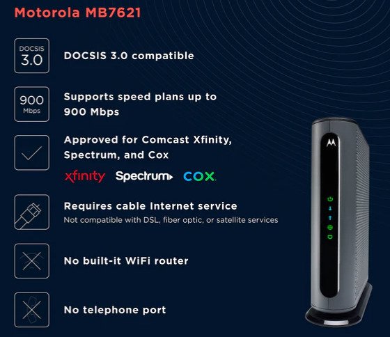 Here are some highlights of the Motorola MB7621 cable modem:
